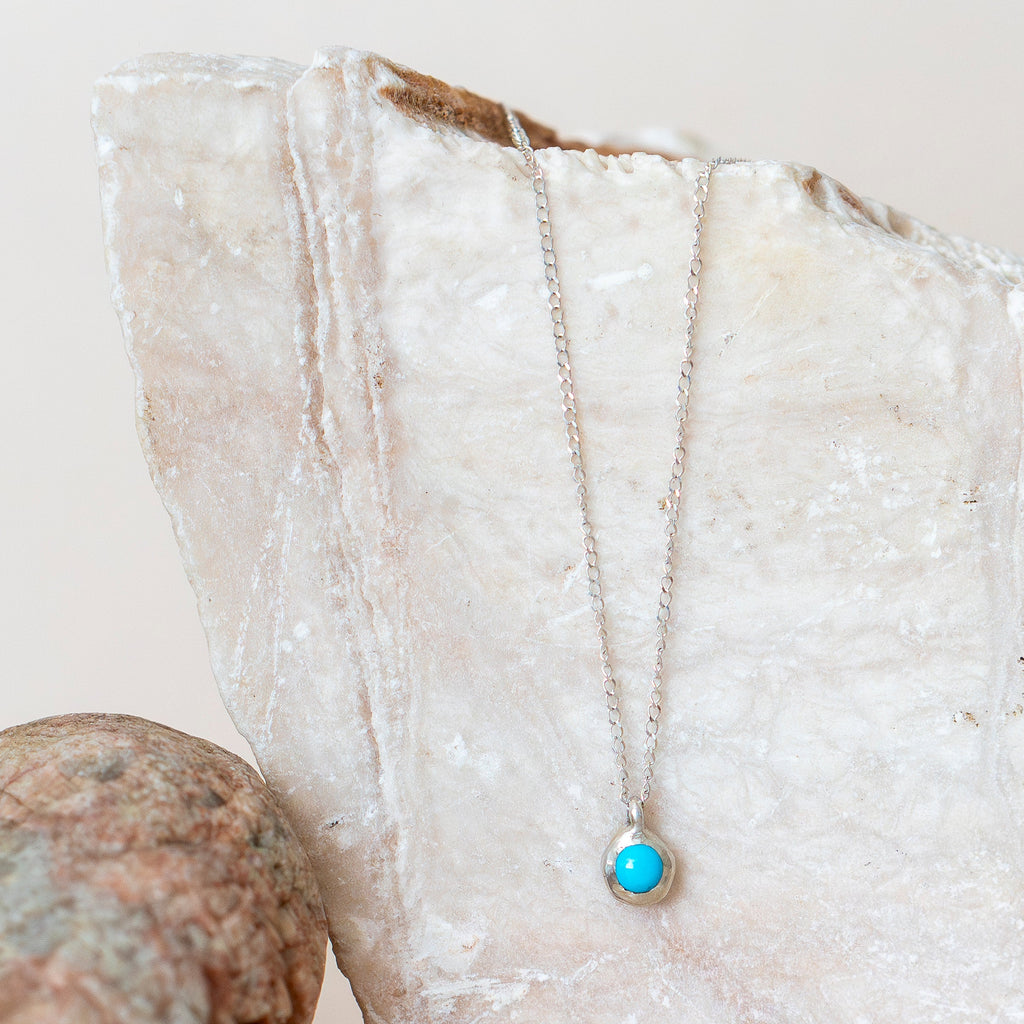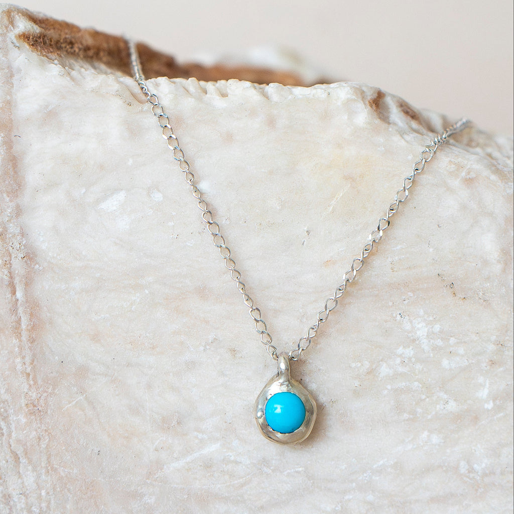 Sterling silver charm pendant featuring genuine Sleeping Beauty turquoise, a semi-precious stone prized for its vibrant hues. This versatile piece measures 1/2" h x 1/3" w x 1/4" d and comes on an 18" sterling silver cable chain, making it ideal for layering or wearing solo. The organic character of the setting is beautifully unique. Perfect for everyday wear!