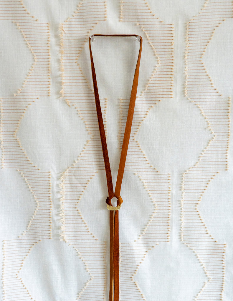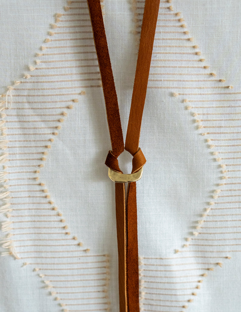 Wrap once or twice around the neck and finish with the Cassia Ring as a focal closure. The lightweight, hand-cut leather tassels add movement without bulk.