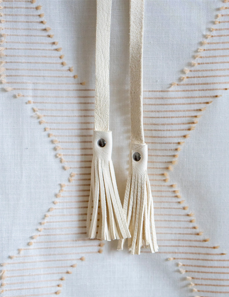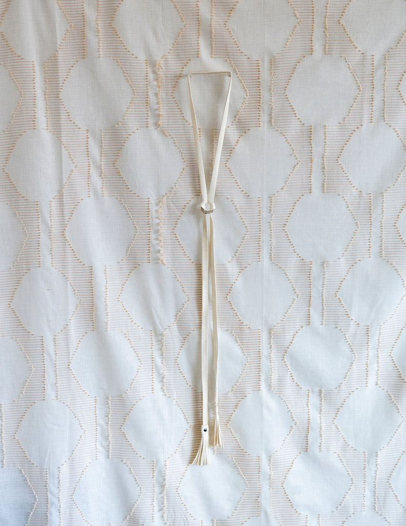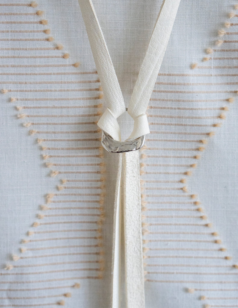 Wrap once or twice around the neck and finish with the Cassia Ring as a focal closure. The lightweight, hand-cut leather tassels add movement without bulk.
