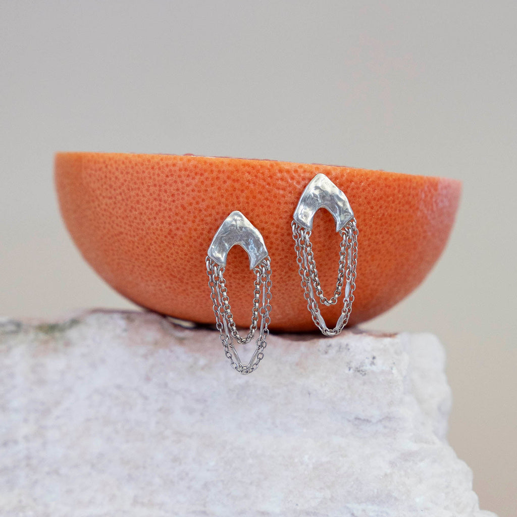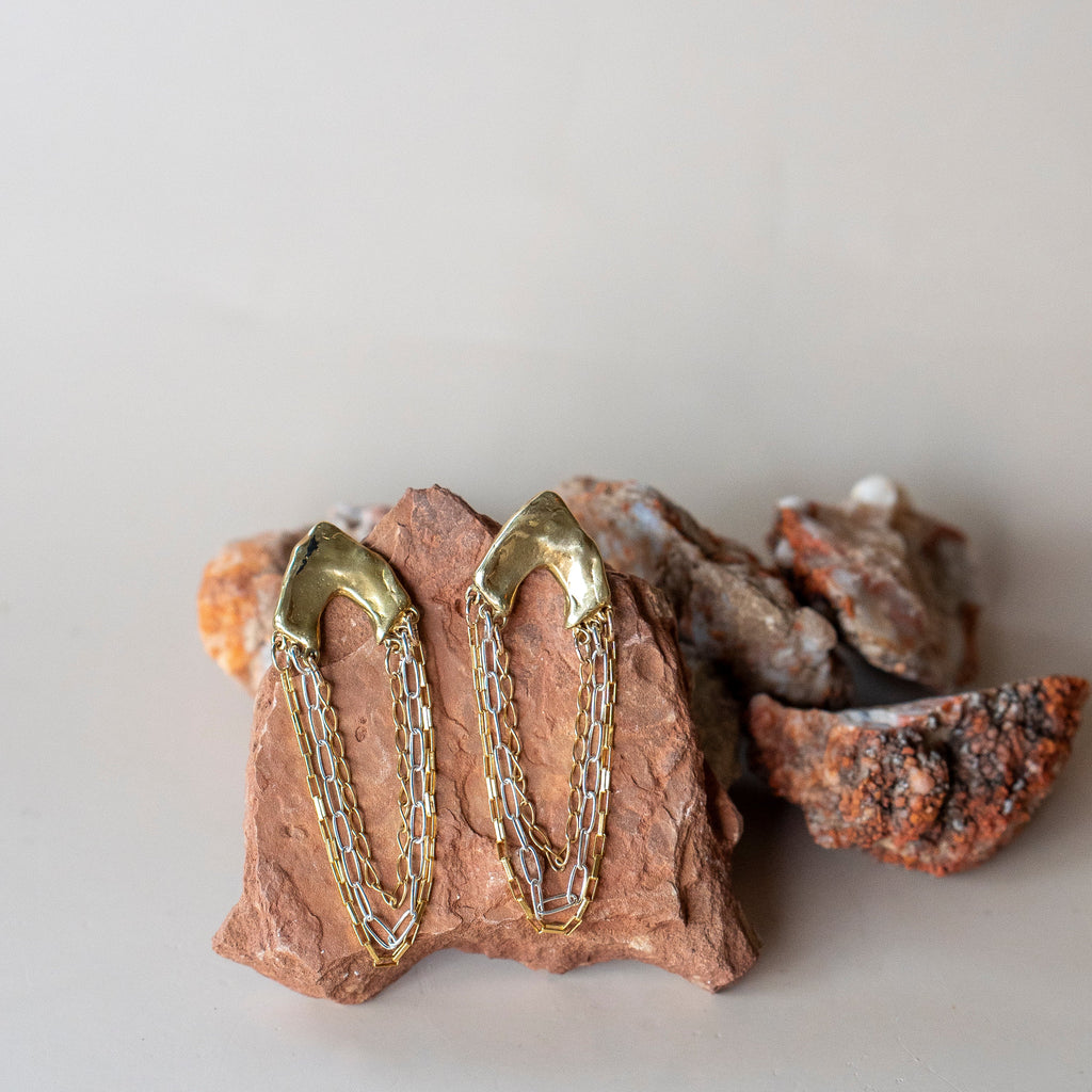 Beautiful Chevron shaped posts with trails of gold filled chain and silver chain that sparkle as they dangle. Chains used for these earrings are all pieces of leftover scrap or ends of chain rolls that weren't quite long enough for a necklace. These parts all come together to become serious stunners. Dangles with an edge.