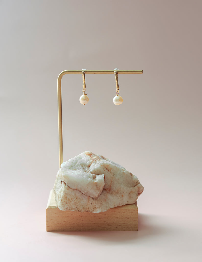 Subtle light peach colored Freshwater pearls dangling from hand carved Beam Bars in brass on Sterling silver earring posts.